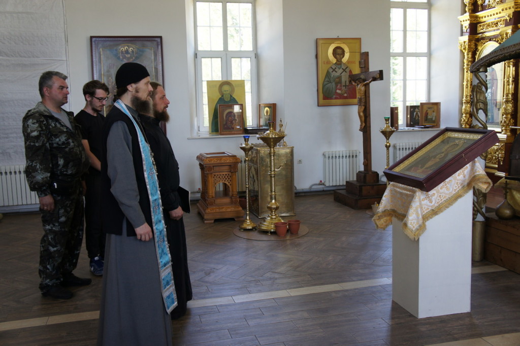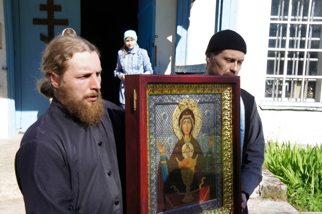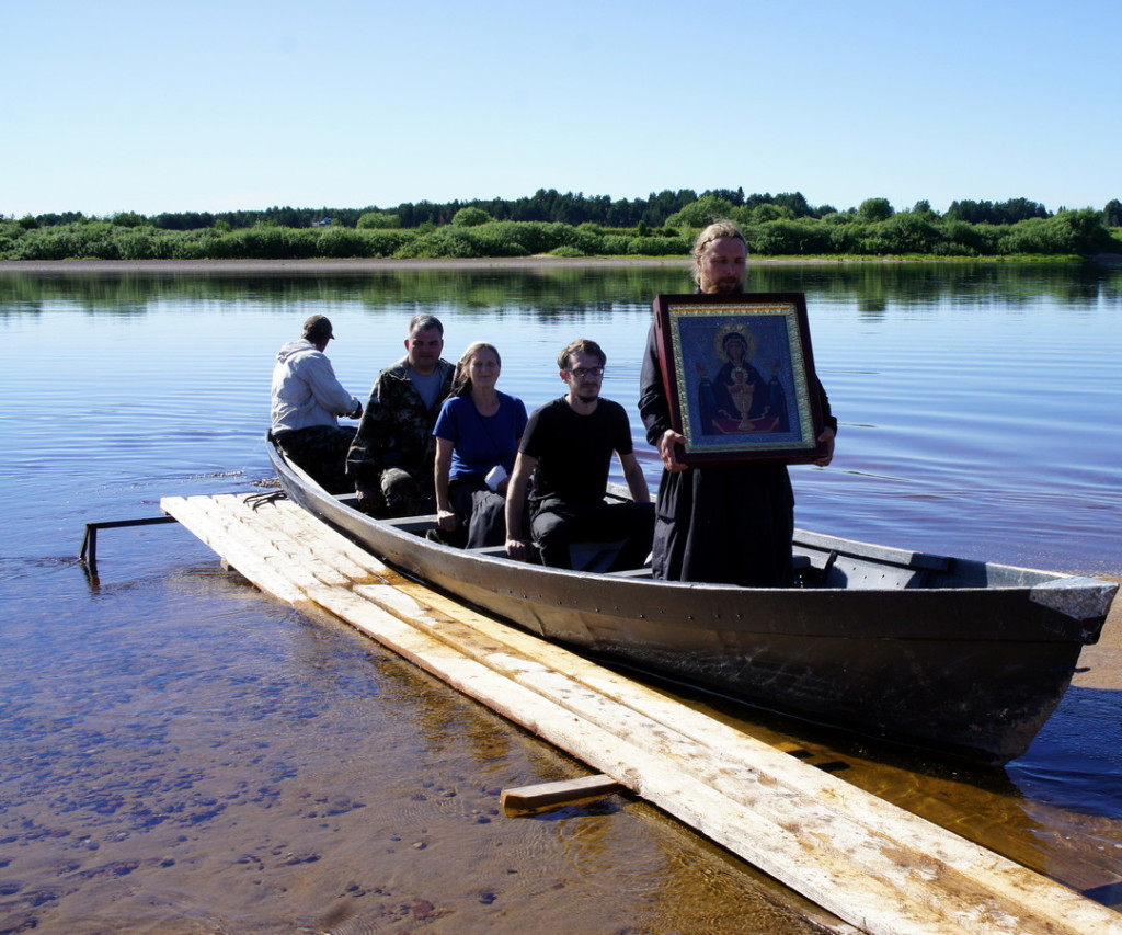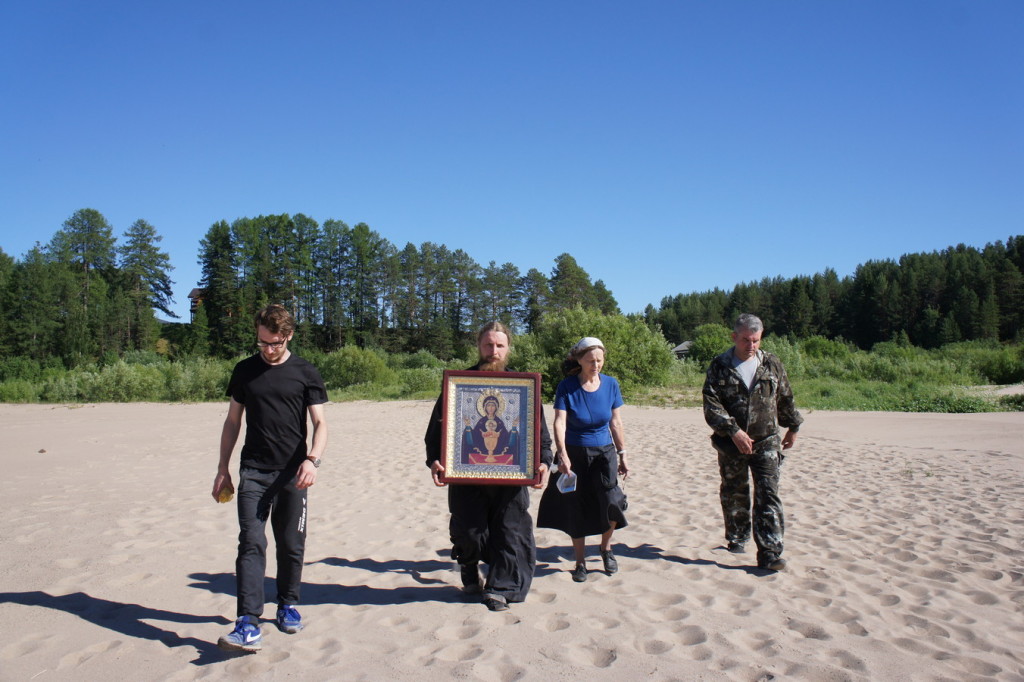 Наместник обители, благочинный Пинежского округа игумен Иосиф (Волков) и отец Сергий в Артемьевском храме отслужили молебен перед чтимым образом Богородицы, вынесли его из церкви и передали в руки крестоходцев. Икону по очереди донесли до берега и переправили на лодке, а дальше на машине довезли до Сосновки, которая находится в девяноста километрах от Веркольской обители.