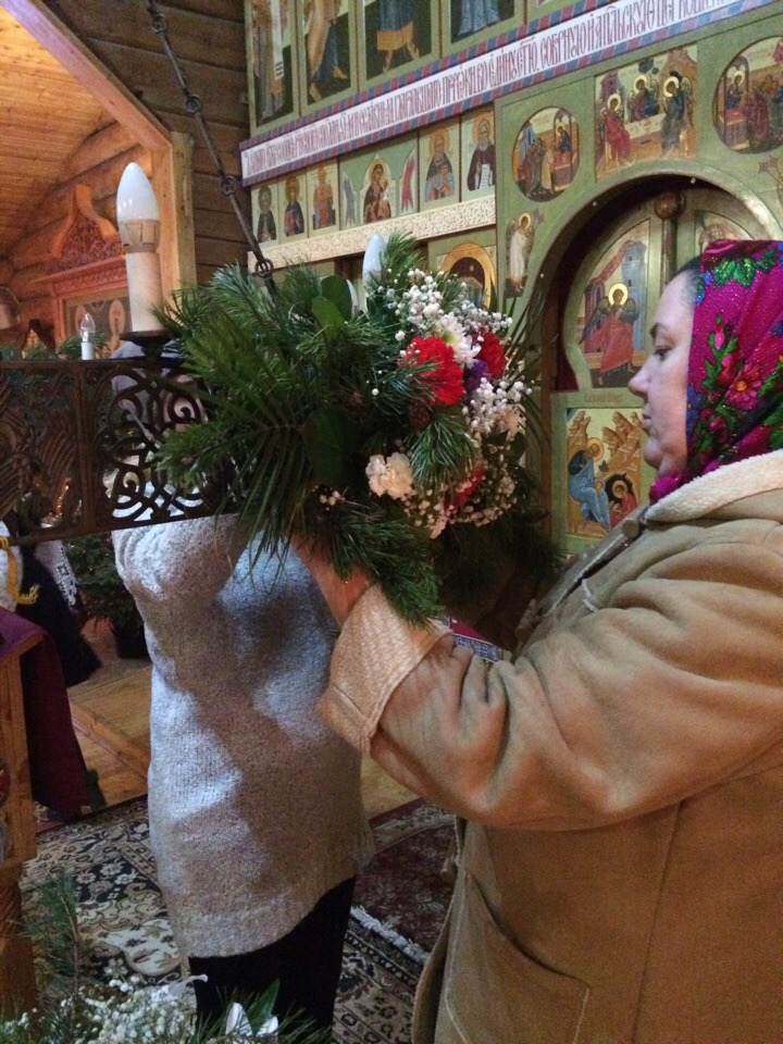 Затем за три дня до установки приходской клуб приглашает желающих съездить в лес за сосновыми веточками. В этом году откликнулось 11 человек. Обычно эти поездки проходят очень дружно и весело. Потом эти ветки завозятся на квартиры и устанавливаются в ванны с тем, чтобы ветки могли напиться водой, ведь на морозе растения практически не пьют.